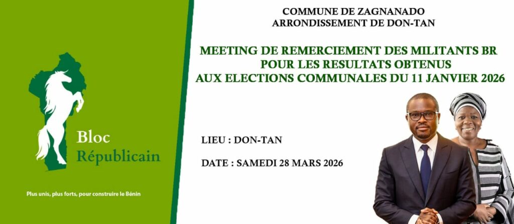 Le samedi 28 mars 2026, la commune de Zangnanado a vibré au rythme d’un meeting de remerciement organisé par les militants du Bloc Républicain (BR). Cette rencontre, placée sous le signe de la reconnaissance et de la mobilisation, a rassemblé une foule enthousiaste venue célébrer les résultats obtenus lors des élections communales du 11 janvier 2026. Dans une ambiance festive, les leaders locaux ont exprimé leur gratitude aux populations et fixé un nouvel objectif politique, porter le duo Romuald Wadagni–Mariam Talata à la magistrature suprême avec un taux de participation dépassant les 90 % lors de la présidentielle du 12 avril prochain.